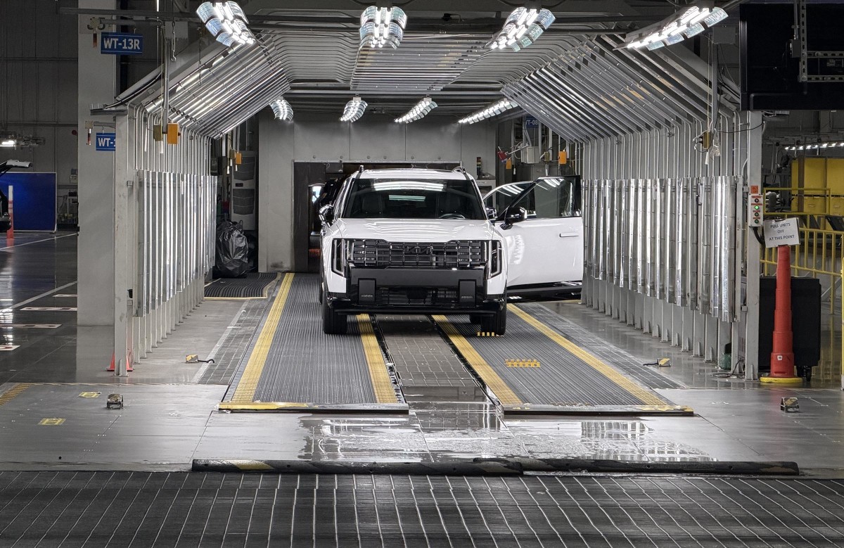 Um Kia Telluride Hybrid 2027 chega à linha de montagem da montadora em West Point, Geórgia.