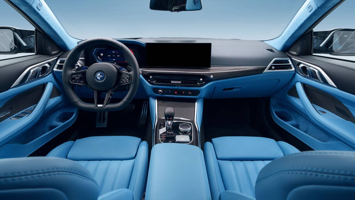 O interior é claramente herdado do M4, mas os materiais foram significativamente melhorados – o que não é nenhuma surpresa, uma vez que Bovensiepen foi fundada pelos filhos do fundador da Alpina, e BMWs Alpina sempre foram um avanço na qualidade. O couro Merino é padrão, com couro Lavalina em cores como Mugello Red, Verde Heritage, Birch e Heaven (azul). A cor que você escolher se estende aos pilares do teto, alavanca de câmbio e painéis das portas.