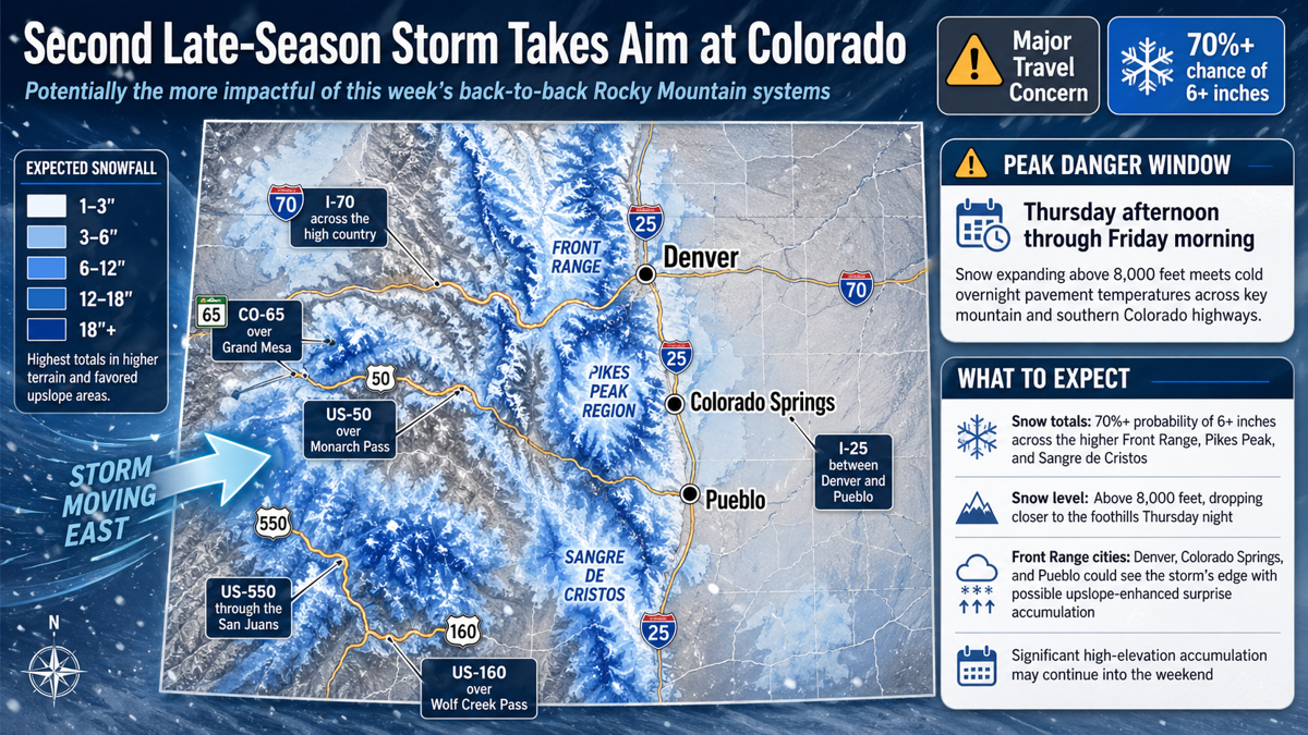 Uma segunda tempestade no final da temporada está atingindo o Colorado e os meteorologistas estão sinalizando-a como potencialmente a mais impactante dos sistemas consecutivos que atingiram as Montanhas Rochosas esta semana. O Centro de previsão do tempo já está prevendo altas probabilidades de neve significativa em Front Range, Pikes Peak e Sangre de Cristos de quarta à noite para sexta-feira, colocando os principais corredores montanhosos de volta à zona de perigo no momento em que os motoristas estavam recebendo um breve alívio da primeira tempestade desta semana.